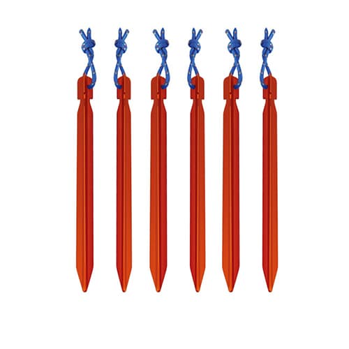 These lightweight and brightly-colored aluminum pegs go easily into the ground and thanks to the pull cord come out easily - but not until you want them to! They come in sets of 6 and are available in two different sizes.Specifications