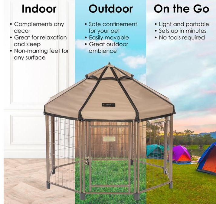 EASY TO ASSEMBLE IN MINUTES, WITH NO TOOLS REQUIRED; HIGH QUALITY PET GAZEBO WITH HEAVY DUTY GALVANIZED STEEL CONSTRUCTION; UNIQUE OCTAGONAL DESIGN PROVIDES A MARVELOUS LOOK & A MORE SPACIOUS DESIGN FOR YOUR PET
