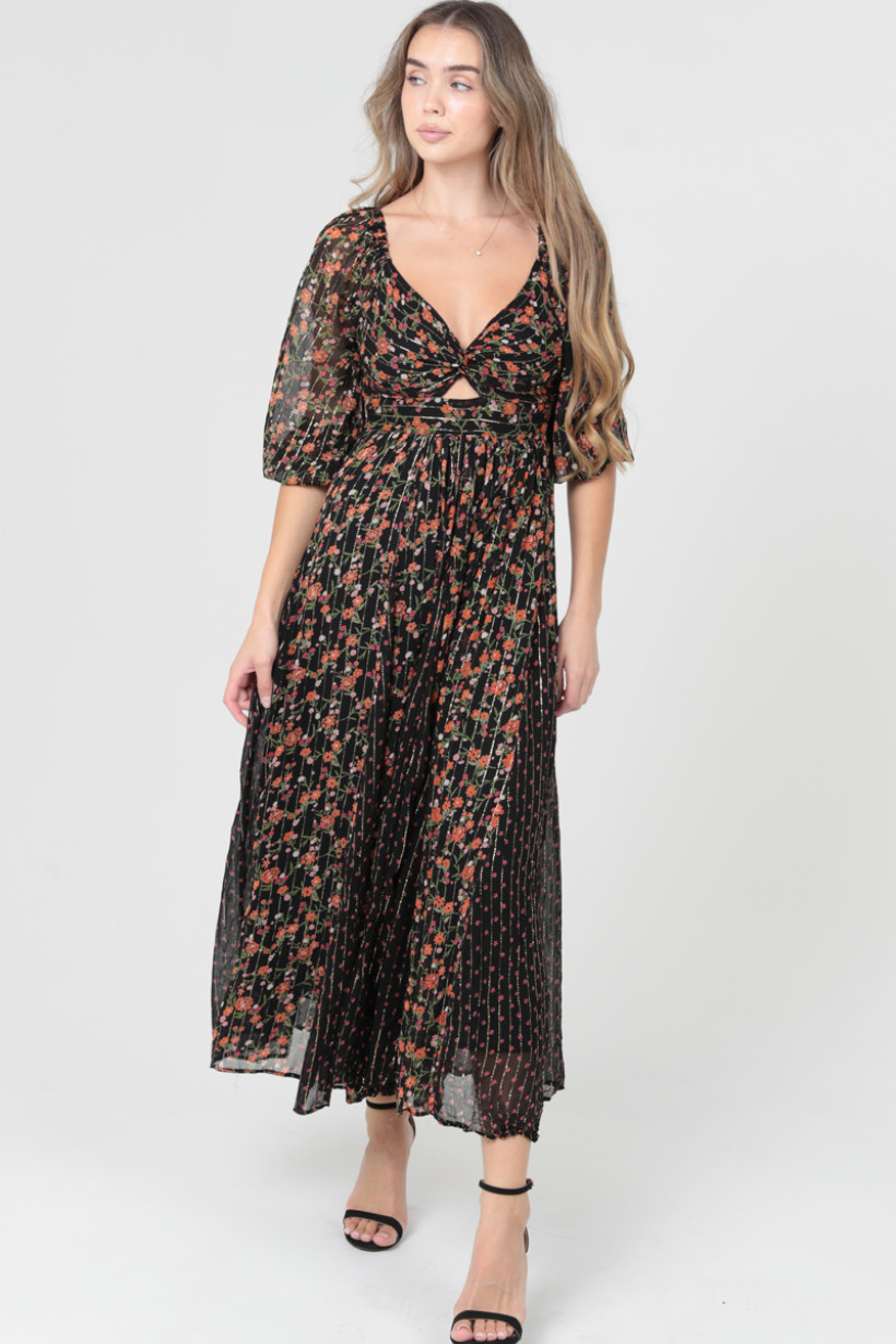MIDLENGTH; MULTI LAYER: SHEER OVERLAY WITH BUILT IN SLIP; MULTI PATTERN PLEATS; PUFF HALF SLEEVES; RIBBED BODICE BACK; TWISTED KEYHOLE NECK DETAIL