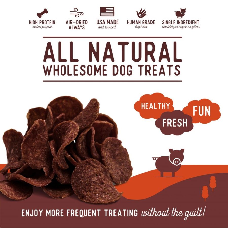 AIR-DRIED TO LOCK IN THE NUTRIENTS & FLAVORS OF THE MEAT; CRUNCHES & CREATES A HIGH VALUE MOMENT; INTENDED AS A FUN TREAT TO AID RESTRICTED OR LIMITED DIET PLANS FOR GUILT-FREE SNACKING WITH NOTHING ARTIFICIAL; MADE WITH 100% HUMAN GRADE PORK HEARTS ONLY FROM & IN THE USA; NATURALLY AIR-DRIED DISC OF PORK HEART; NOTHING ARTIFICIAL, JUST A PURE MEAT TREAT