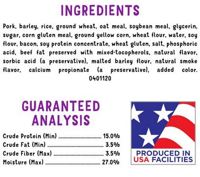 Watch your furry friend go absolutely nuts for Purina Beggin' Strips With Bacon and Beef Flavor Adult Dog Treats. These tender jerky dog snacks feature real meat as the very first ingredient along with real bacon. The irresistible combo of double-yum in these soft dog treats is sure to make your pooch drool in anticipation. As the tantalizing aroma of bacon wafts through the air when you grab these soft chew dog treats, your four-legged friend's excitement level goes through the roof. Watch as he wiggles and waggles as soon as he catches sight of the soft treats for dogs, and his meat-crazed mind has only one goalBeggin! Give your dog one of these soft and chewy dog treats when he welcomes you home, or break the jerky dog treats into smaller strips to reward him for being a good boy. Made with no artificial flavors or FD and C colors, these Beggin' Strips Bacon and Beef flavored dog treats deliver the big, bold, bacony taste your dog loves.Specifications
