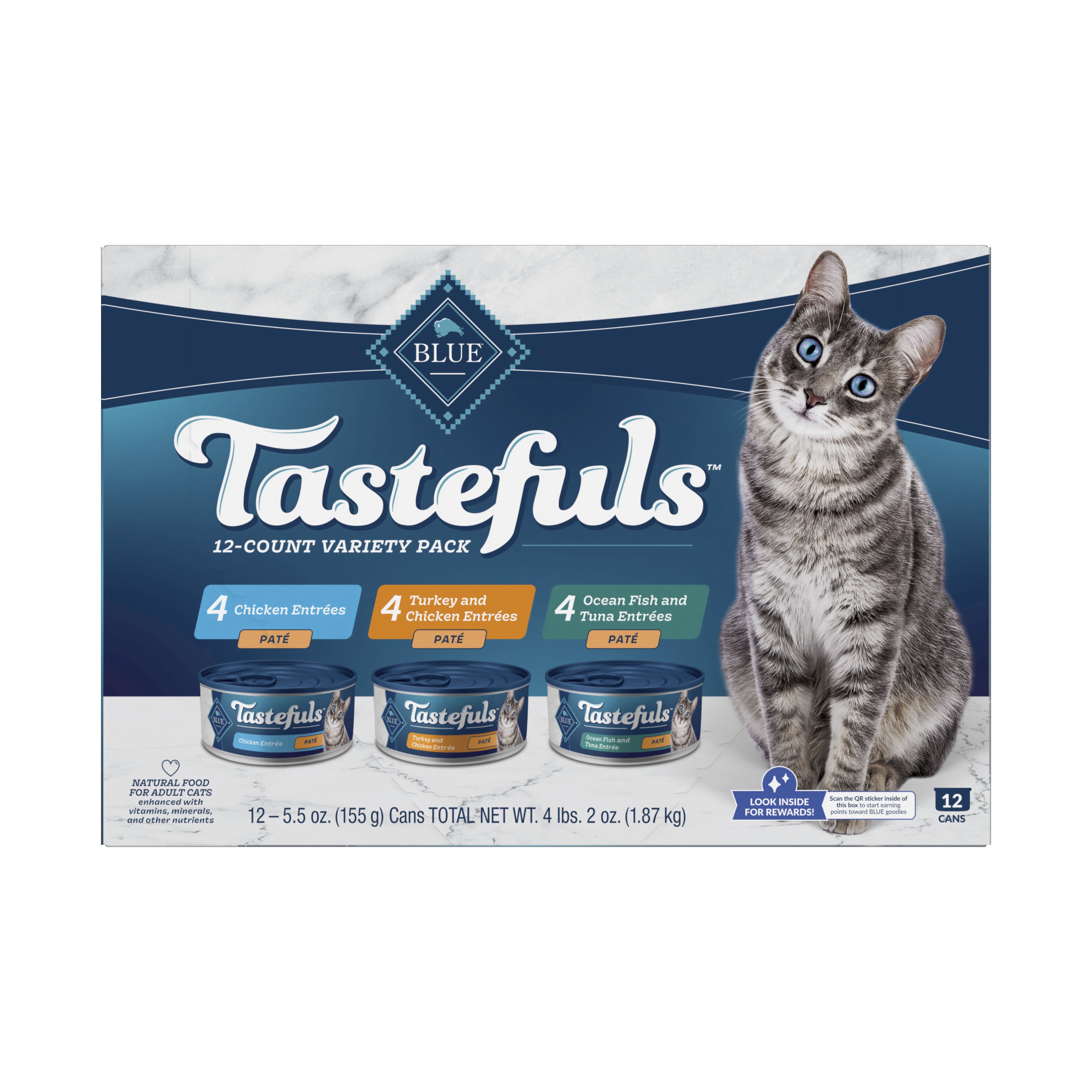 Made from the finest natural ingredients plus vitamins, minerals and other nutrients, our canned cat food has the great taste cats want with the healthy ingredients you prefer feeding; Tastefuls canned cat food has the great taste cats want; This BLUE Tastefuls canned food variety pack gives your cat a tasty trio of silky-smooth pates starting with high-quality chicken, turkey or whitefish.