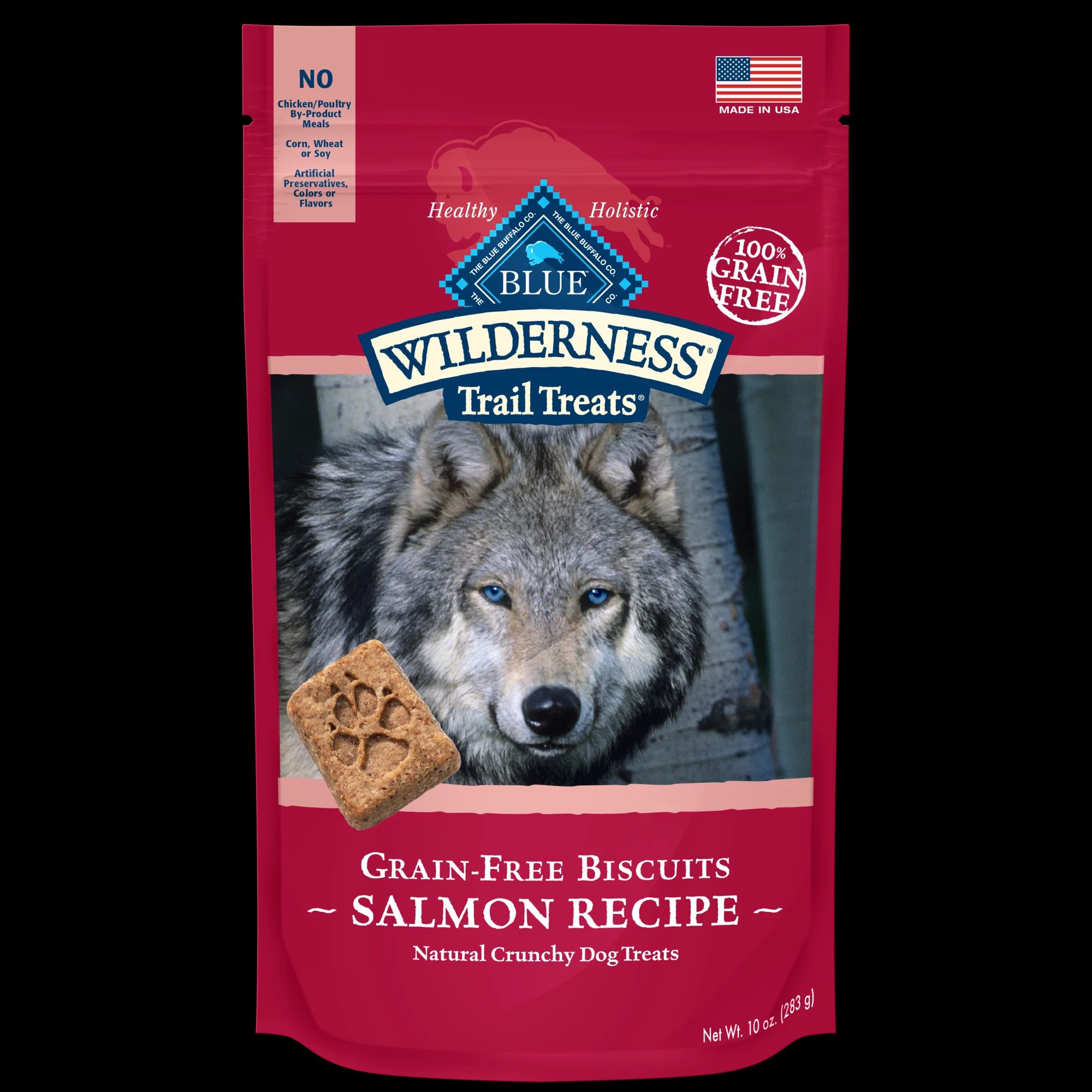 A perfectly crunchy dog treat for meat-loving dogs, BLUE Wilderness Trail Treats High-Protein Crunchy Dog Biscuits feature real salmon as the first ingredient. These high-protein and grain-free dog treats are made with the finest natural ingredients. Bring out the wolf inside your dog with tasty salmon, potatoes, and flaxseed packed into every bite. Like all Blue Buffalo dog treats, these treats for dogs don't contain chicken (or poultry) by-product meals, corn, wheat, soy, artificial flavors, or preservatives. Watch your dog's tail wag when you reward them with BLUE Wilderness Trail Treats High-Protein Crunchy Dog Biscuits.Specifications