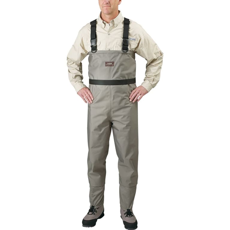 Attached Gravel Guards; Attractive Tan Color, Heavy-Duty Polyester Material; Caddis Dry Breathable Technology; Foot Taped Inside and Out; H-Style Suspenders with Wader Belt; Seams Taped Glued and Stitched