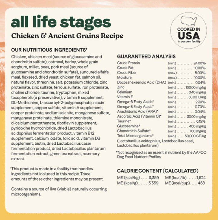 ANTIOXIDANTS FOR A HEALTHY IMMUNE SYSTEM; OMEGA 6 & 3 FATTY ACIDS FOR SKIN AND COAT; OPTIMAL PROTEIN AND WHOLESOME GRAINS FOR ALL DOG LIFE STAGES; PREMIUM DOG FOOD CRAFTED FOR MULTI-DOG HOMES; PROBIOTICS FOR A HEALTHY DIGESTIVE SYSTEM; VET FORMULATED WITHOUT WHEAT, CORN, OR SOY