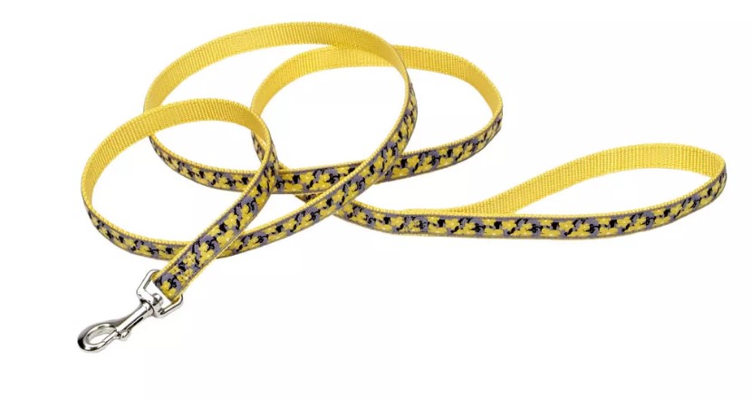 BRIGHT, COMPLEMENTARY COLORS ON FADE-RESISTANT NYLON; DURABLE NYLON PROVIDES LONG-LASTING USE; PAIRS WITH MATCHING RIBBON DOG COLLAR AND HARNESS TO COMPLETE THE LOOK; PATTERNED RIBBON OVERLAY PROVIDES A CONTEMPORARY, STYLISH LOOK; PERFECT FOR DOGS OF ALL SIZES