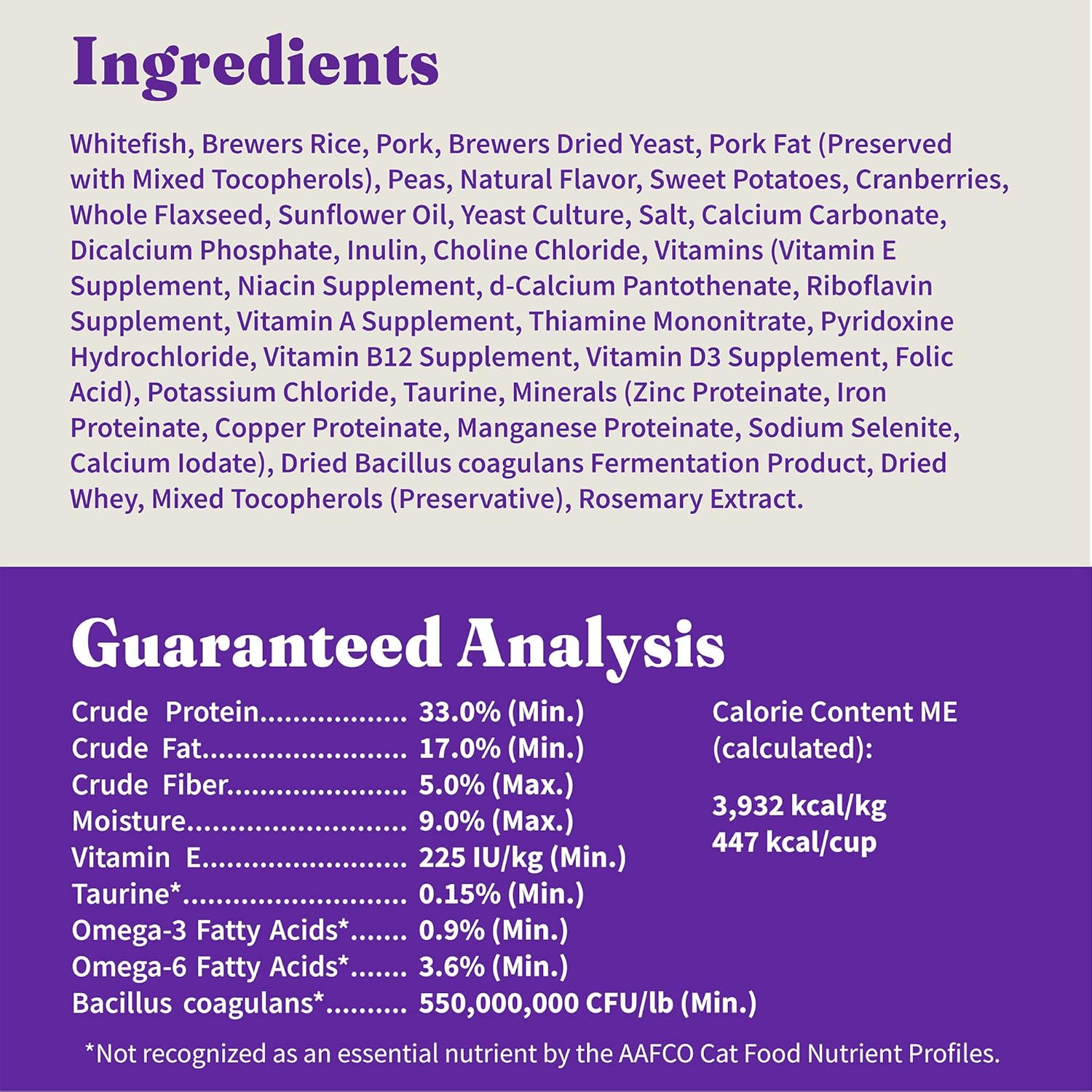 Cat moms, we know you want to feed your furry child the best. Start with Halo Holistic Wild-caught Whitefish Recipe dry cat food for sensitive stomach support, our holistic cat food recipe is made with whole, certified whitefish as the first ingredient. With a delicious flavor and kid-approved aroma, this meal offers high-quality protein to give them a boost of energy and help support muscle maintenance. This natural cat food dry recipe has added vitamins, minerals and nutrients to help provide complete nutrition for adult cats. Every serving of Halo cat kibble is loaded with prebiotics and probiotics for cats, plus postbiotics to support digestion for sensitive stomach cats. Our cat digestive health recipe has optimal levels of omega fatty acids for healthy skin and a radiant coat. The ultra-premium cat food recipes are cooked in the USA and use only real, whole, easy-to-digest protein and no meat meal of any kind. Halo dry cat food whitefish recipe is clean nutrition you can trust. Wondering how much to feed them? We've got you covered. Just refer to the recommendations on adult cat food bag.Specifications