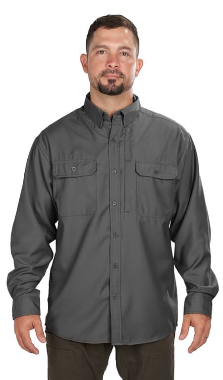 5 oz. Fabric; Hidden Snap down Collar; Long Sleeve; Magnetic Closures on Pockets; Pocketed