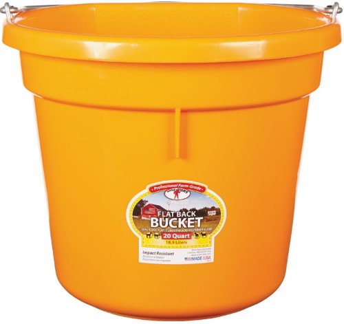 Little Giant Flat-Back buckets are a favorite on farms and ranches everywhere. The Flat-Back fits more compactly for hanging against a wall or fence plus it makes hauling heavy loads a lot easier. Our buckets are made from polyethylene resin that is impact resistant protects against warpage and helps prevent stress cracks. This bucket features a heavy-duty wire bail with notch for hanging and stacking ribs so the pails come part easier when stacked. Holds 20 quarts 5 gallonsSpecifications