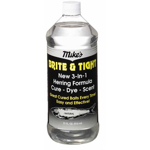 Anglers have long known that brined bait holds up better than bait that has not been brined especially frozen. Mikes Brite and Tight makes curing your baits as easy as unscrewing the cap pouring the formula into a container or zip lock bag and soaking it overnight. What could be more simple? Not only does Mikes Brite and Tight brine so baits last longer and are brighter but they have taken it a step further by adding dye and scent to improve the performance. Brite and Tight is UV enhanced which adds more visibility particularly in low light conditions while offering you the advantage that results in more fish! This easy no mix formula makes great prepared bait every time that will give you the edge professional anglers depend on in their businesses. Cure it right, use Brite and Tight!Specifications