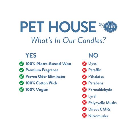 100% COTTON WICK; 100% NATURAL SOY WAX; CONTAINS NO PARAFFIN/PETROLEUM BY-PRODUCTS; HAND-POURED IN THE USA; PREMIUM, NON-TOXIC FRAGRANCES; REUSABLE JAR; SPECIALLY FORMULATED TO FRESHEN PET-LOVING HOMES; TESTED & PROVEN TO ELIMINATE 99% OF PET ODORS; UP TO 60 HOURS OF BURN TIME