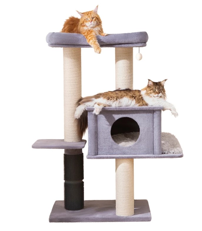 Introducing PetPals' Extraordinary Lulu Extra Large Cat Tree, perfect for large breeds and multi-cat homes. Features include an extra-large rubber groomer for soothing grooming sessions, a spacious condo with a removable premium shag fur cushion for comfort, and natural sisal scratching posts to promote healthy habits. Crafted from high-quality shag fur material, it offers a soft, inviting space for relaxation. An elevated plush perch provides a secure vantage point for your cat's viewing pleasure! The extra-large massager helps maintain your cat's coat health and the large sisal scratching posts help redirect healthy scratching instincts. Treat your cat to the ultimate blend of comfort and wellness with the PetPals Lulu Cat Tree!Specifications