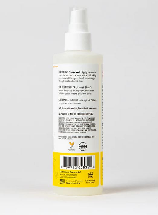 Hydrates and deodorizes the skin and coat for a fresher, better-smelling pet in between washes. It provides a premium grooming experience without disturbing the skin's natural microbial community.Skout's Paw Pledge: Together we provide a day's worth of food to an animal in need, with every product sold (Buy a Bottle, Feed an Animal).Specifications