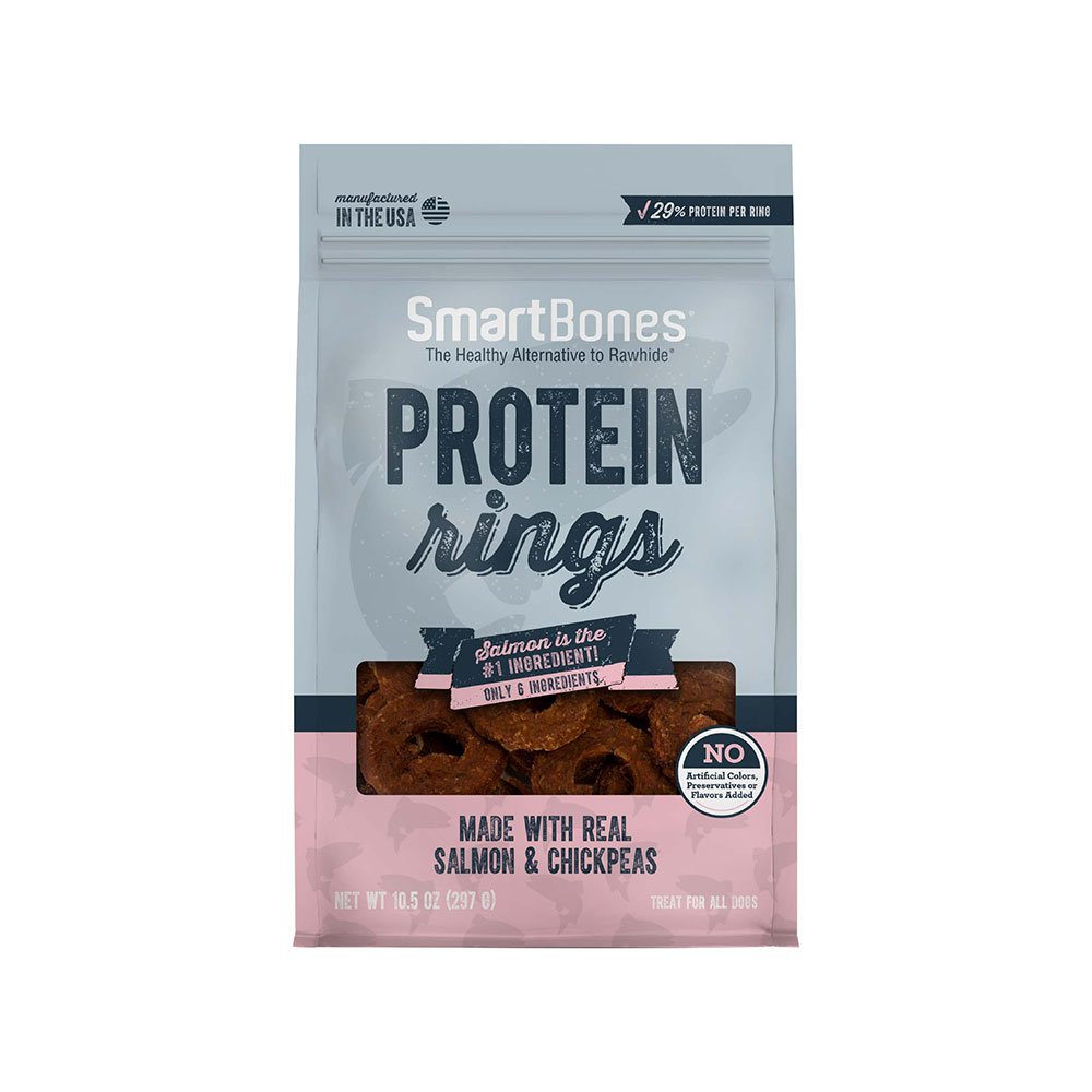 Scrumptious SmartBones Protein Rings Made with Real Salmon and Chickpeas are the perfect reward or in-between snack to keep your dog happy and satisfied. Not only are these treats delicious, but with 29% protein in each ring, they’re a good source of protein! You can feel good about giving these wHOLE-some, 6-ingredient treats to your pup. Salmon is the #1 ingredient and they’re made with no artificial colors, flavors or preservatives; no added wheat, soy or corn; and no chicken added. Plus, they’re manufactured and sourced in the USA.Specifications