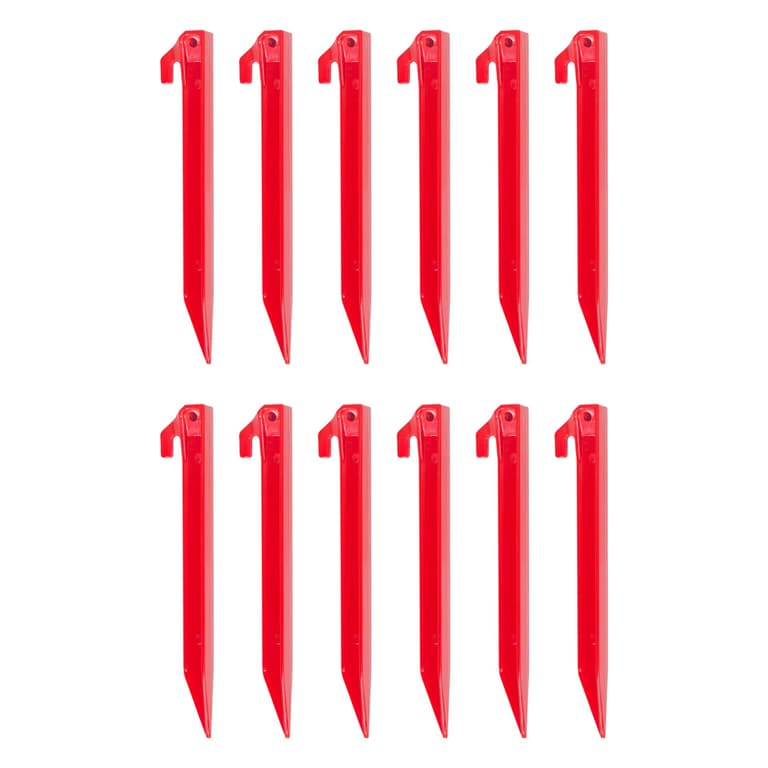These 9" plastic tent stakes are made from lightweight impact resistant ABS plastic. The three-sided design holds firm even in sandy soil. Its eyelet and hook allows for easy attachment to tents and rain flies.Specifications